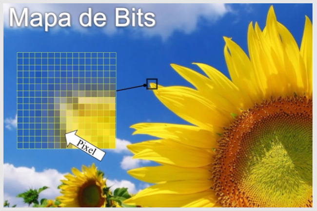 MAPAS DE BITS: Las imágenes en mapas de bits (o bitmaps) también llamadas imágenes de trama, utilizan una gran cuadrícula compuesta de un conjunto de puntos o pixeles los cuales poseen una posición fija en (x,y) y una intensidad de color propios. Los bitmaps se usan típicamente para representar imágenes que contienen una gran cantidad de detalle, sombreado y color. Las fotografías, los negativos y otro tipo de ilustraciones se almacenan usualmente como mapas de bits, aunque realmente cualquier imagen es susceptible de almacenarse de esta manera.